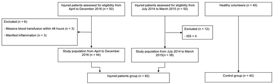 The patients were grouped together for the retrospective analysis (n = 82). Time points were identified for the analysis of AChE activity: hospital admission (primary survey) and stabilization (secondary survey). The second measurement, corresponding with the stabilization of the patient (i.e., patient achieving a steady state, no immediate further procedures necessary), was defined between 4 and 12 h following admission. This time frame was chosen to fit measurement times from all data sets [31]. The median time between measurements was 720 (with an interquartile range of 360–720) min. The control group comprised a sample of 40 healthy volunteers with no sign of infection or evident chronic disease, where AChE activity was measured once after obtaining a signed consent (Table 1, Figure 1).