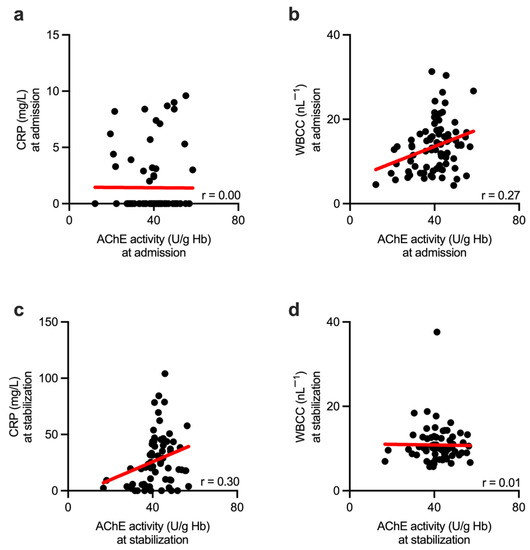 We next evaluated whether the observed change in AChE activity correlated with the conventional inflammatory biomarkers CRP and WBCC. We performed the correlation analysis at the time point of hospital admission and at the stabilization phase, 4–12 h following hospital admission. AChE activity showed no correlation with unaffected CRP levels measured at hospital admission (Figure 3a). In contrast, AChE activity correlated well with the WBCC at this time point (Figure 3b). Next, a mild but significant correlation between AChE and CRP was observed at the time point of the secondary survey, 4–12 h following hospital admission (stabilization phase) (Figure 3c). However, a correlation between AChE and WBCC was lost at this time point (Figure 3d).