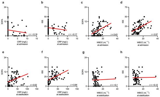 Correlation between measurement time and disease severity scores with conventional inflammatory biomarkers. CRP shows no correlation with the disease severity score SOFA. (a) nor with injury severity score ISS (b) when measured at the hospital admission. WBCC strongly correlates with SOFA (c) and ISS (d) at the same time point. Measurements obtained during the stabilization phase reveal a strong correlation between CRP and SOFA (e) as well as ISS (f) scores. WBCC showed no correlation with the disease severity scores SOFA (g) nor with ISS (h) at this time point. SOFA—Sequential Organ Failure Assessment; ISS—Injury Severity Score; CRP—C-reactive protein; WBCC—white blood cell count; r—Spearman correlation coefficient.