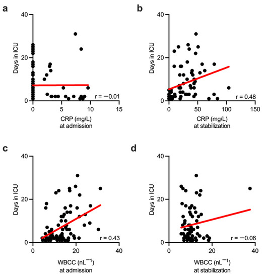 We next tested whether a change in the activity of conventional inflammatory biomarkers, when measured at given time points, could predict the length of the patient’s stay in the ICU. CRP activity, when measured at hospital admission, did not correlate with the length of ICU stay (Figure 5a). Nevertheless, CRP activity obtained during the stabilization phase of the trauma care correlated well with the length of patient stay at the ICU (Figure 5b), suggesting that later CRP measurements better correlated with the ICU length of stay than those initially obtained from injured patients. Conversely, initially measured WBCC correlated well with the length of ICU stay (Figure 5c). WBCC obtained during the stabilization phase showed no correlation with the length of ICU stay (Figure 5d), indicating that only initially obtained, but not subsequent WBCC measurements, correlated with the length of the ICU stay.