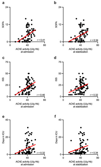AChE activity correlated with the disease severity scores and the length of the ICU stay throughout the early period of the sterile inflammation. AChE activity was measured at hospital admission (a) and at the stabilization time point, 4–12 h following hospital admission (b), correlated with SOFA score obtained from injured patients 24 h following hospital admission. AChE activity was measured at hospital admission (c) and, following the stabilization (d), correlated with the ISS score obtained from injured patients. Initially measured AChE activity (e), as well as AChE activity obtained during the stabilization phase (f), correlated with the length of ICU stay of injured patients. AChE—acetylcholinesterase; SOFA—Sequential Organ Failure Assessment; ISS—Injury Severity Score; ICU—intensive care unit; r—Spearman correlation coefficient.
