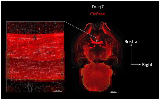 Topography of CNPase expression in the mouse brain: OLs residing in the anterior commissure are myelinating this interhemispheric fiber tract. Right: full brain horizontal section in which the myelin and OL marker CNPase (red) was revealed using immunofluorescence and imaged using epifluorescence slide scanning. Left image is a close-up view of the anterior commissure region pointed at by arrow. Nuclei were revealed with Draq7 (white).