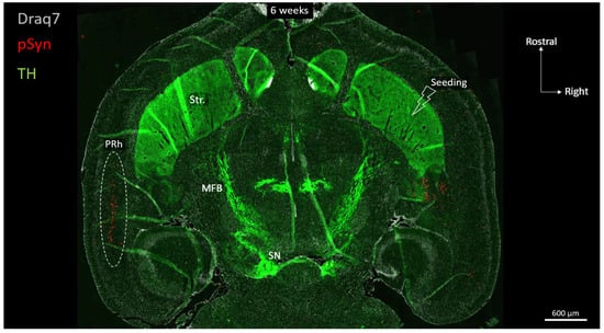 Horizontal topography of Tyrosine Hydroxylase (green, TH), α-Syn pathology (red, pSyn), and cell nuclei (white, Draq7) 6 weeks after seeding with 1B fibrils into the right striatum of a wild-type mouse (10 µm full brain section). SN: Substantia nigra; MFB: median forebrain bundle; Str.: ventral striatum (nucleus accumbens core and shell); PRh: perirhinal cortex.