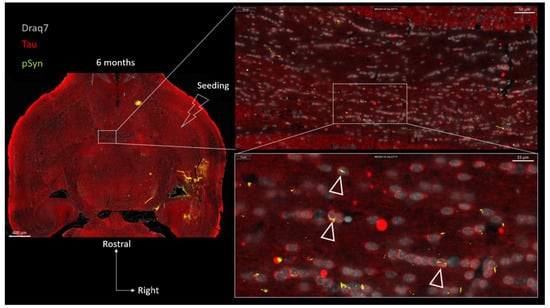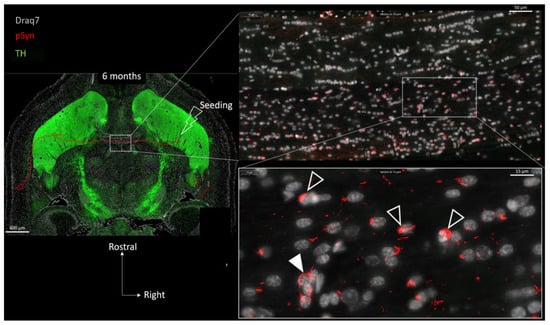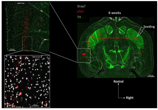 - Luk, K.C.; Kehm, V.; Carroll, J.; Zhang, B.; O’Brien, P.; Trojanowski, J.Q.; Lee, V.M.Y. Pathological α-Synuclein Transmission Initiates Parkinson-like Neurodegeneration in Nontransgenic Mice. Science 2012, 338, 949–953. [Google Scholar] [CrossRef]