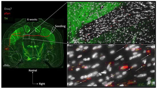Concatenated zoomed views of the α-Syn pathology in the posterior limb of the anterior commissure. The section is the same as in Figure 3 and Figure 4 with Tyrosine Hydroxylase in green, (TH) α-Syn pathology in red (pSyn, pSyn#64 antibody), and cell nuclei in white (Draq7) 6 weeks after seeding with 1B fibrils (10 µm full brain section). The zoomed view shows numerous Lewy Neurites with a parallel course (dotted arrows) corresponding to the commissural axis. Red drawing in the topographic view: schematic sketch of a perirhinal cortico-striatal neuron with a contralateral projection passing through the anterior commissure.