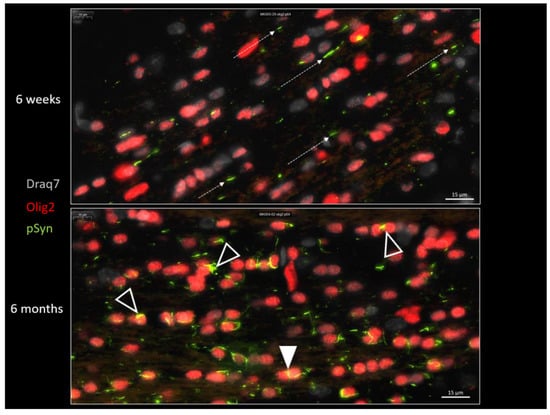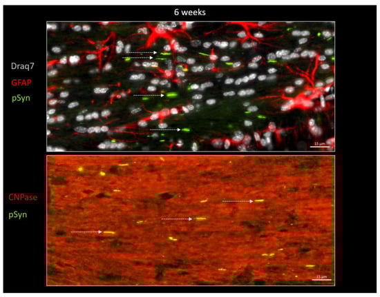 In agreement with the previous considerations, many pSyn-positive LNs are indeed detected, delineating the parallel trajectories of the axons traveling in this anatomical structure (Supplementary Figure S2 confirms that the latter commissural LNs represent pathological segments of crossing Neurofilament-positive axons). This region is of particular interest because it can be considered as a “connecting wire” containing no neuronal somata or dendrites, but only traveling axons that are “insulated” by myelin sheaths [47] (Figure 1 and Figure 2). Thus, the vast majority of the cell nuclei that are detected in the anterior commissure correspond to interfascicular OLs (around 90%) with the remaining fraction of cell bodies corresponding to a few astrocytes and microglial cells [47] (Figure 1 and Figure 2). At 6 weeks, the LNs that collectively travel in parallel do not delineate any cell bodies.