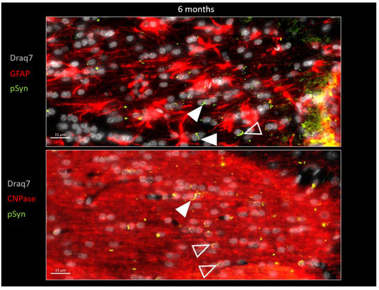 In order to further document this phenomenon, immunofluorescence detection of GFAP and of CNPase was also carried out on other brain sections in order to spot, respectively, the astrocytes and the myelin sheaths together with the LNs at both 6 weeks and 6 months (Figure 7 and Figure 8). Figure 7 again shows the ensemble parallel course of commissural LNs observable at 6 weeks (pSyn positive), corresponding to the axonal route highlighted by the myelin sheaths (CNPase positive). At this stage, the LNs are not delineating cell bodies, and are not correlated with the position of astrocytes (GFAP). Figure 8 confirms the tremendous change observed at 6 months, with the loss of parallel organization, the fragmentation and the curl-up of LNs (pSyn), with a few “perpendicular” LNs squeezed in-between perifascicular OLs (plain arrowheads), and certain images compatible with an internalization by OLs with a cell body delineated by CNPase (empty arrowheads). At this stage also, the distribution of fragmented/curled-up LNs does not appear to be correlated with the position of astrocytes (GFAP).