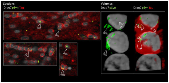 Enlarged 2D (section of Figure 10) and 3D (volume) views of the oligodendroglial α-Syn pathology in the posterior limb of the anterior commissure 6 months after seeding with 1B fibrils (10 µm full brain section). Tau is in red (Tau), α-Syn pathology in green (pSyn, EP1536Y antibody), and cell nuclei in white (Draq7). The two lower panels in the “Sections” are further zoomed views of Figure 10. Empty arrowheads point to curled-up LNs internalized into Tau-positive oligodendrocytes forming GCIs and GNIs. The dotted contours delineate the α-Syn pathology that was internalized and which is thus masked by cytoplasmic Tau in the volume view. The volume was reconstructed from a z-stack acquired using confocal microscopy. See the corresponding animation in the Supplementary Movie. Note the presence of a halved nucleus at the base of the strand that belongs to an astrocyte (Tau negative, scattered chromatin). (Scale bars omitted, OL nucleus diameter ≈ 5 µm).