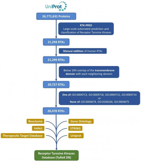 All the reference eukaryotic proteomes (1511) of the UniProt database [30] (December 2020 release) were mapped to their proteins (26,771,631) in UniprotKB, which then were retrieved and analyzed (Figure 1). The protein sequences from the reference proteomes were analyzed with RTK-PRED, resulting in an initial set of 21,294 putative RTKs. This set was further enriched by manually inspecting the pipeline’s negative results for the existence of false negatives in the 58 human RTKs; this resulted in the addition of 5 human RTKs (UniProtKB ACs: P36888, Q01973, P54756, P29322, Q96Q04) and correction of misclassification of 2 human RTKs. The corrections included 1 RTK that belongs to the TIE subfamily and 1 RTK that belongs to the ALK subfamily (UniprotKB ACs: Q02763 and P29376 correspondingly). We do not consider as a misclassification the categorization of LMR or STYK1 RTKs in the “LMR or STYK1” group, but specifically for 3 human RTKs (UniprotKB ACs: Q6ZMQ8, Q8IWU2, Q6J9G0), whose subfamily is known, their classification changed specifically to LMR or STYK1. The set of RTKs was further filtered to remove any sequences with significant overlap between their TM segment with its neighboring EC domains, since residues forming the hydrophobic core of a large domain could potentially be mistaken as a TM segment and lead to false predictions. The overlap threshold was selected to be at least 10% of the TM domain’s length in order to exclude most of the proteins without any actual TM domains; any sequences violating this threshold were excluded. The domains of the 5 human RTKs that were added manually were predicted using the “hmmscan” utility of HMMER and included certain domains that potentially contain transmembrane regions, therefore the extension of the overlap in those cases was allowed at any level. The number of proteins excluded in this step of the analysis is 572. In addition, considering the significant similarity of the kinase domain among Tyr and Ser/Thr kinases, an additional filter was applied to exclude proteins without Tyr kinase activity and only with Ser or Thr or Ser/Thr kinase activity, based on their Gene Ontology terms [33,34], which were retrieved from a Gene Ontology Annotation (GOA) file [35]. From this filtering, 249 proteins were excluded and 20,478 RTKs remained, forming the final dataset of RTKs, which was used to construct the TyReK database.