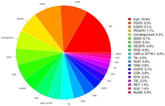 The group of tyrosine kinases is further divided into “receptor tyrosine kinases” (RTKs) and “non-receptor tyrosine kinases” (“nonRTKs”) or else “cytoplasmic tyrosine kinases”. There are 58 well-studied and documented RTKs in the human proteome, based on which a categorization of 20 different subfamilies (Table 1) has emerged [4,5,6,7]. The latter categorization was followed in the current scientific study. In addition, almost all known RTKs share the following specific traits: