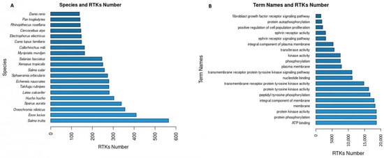 The RTKs of the final dataset (20,478 RTKs) correspond to 445 different species. The 20 first species with the highest numbers in RTKs (Figure 3A) include species of interest since they are not identified as species generally used in studying RTKs (e.g., “Salmo trutta”, “Esox lucius”) neither experimentally nor computationally. Further analysis of the novel RTKs predicted by RTK-PRED in these species could reveal new information regarding their structural and functional aspects or their evolution among the different eukaryotic species. Overall, 1676 unique GO terms were found for 19,071 RTKs, 1668 of which corresponded to GO names, definitions, and domains by YeastMine. The GO names of the first 20 GO IDs (Figure 3B) that corresponded to the highest numbers of RTKs include information about the principal functions of RTKs and their cellular localization (e.g., “protein phosphorylation”, “membrane”). Similarly, 351 RTKs were identified in the data collected from the Reactome database and corresponded to 5493 unique pathways and reactions, 2773 RTKs were identified in the data collected from the STRING database and corresponded to 24,934 unique protein interactors, 153 RTKs were identified in the data collected from the IntAct database and corresponded to 9230 interactions, and 50 RTKs were identified in the information collected from the TTD and corresponded to 1041 unique drugs.