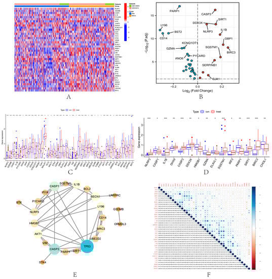 The “limma” package was used to explore the differential expression of 110 PRGs in GSE43974, GSE126805, and their combined datasets. -value < 0.05 and log FC > 0 were used as the threshold for screening differentially expressed PRGs (DEPRGs). The differential results associated with PRGs in the pooled dataset were then visualized in heat maps and volcano maps. The differential results associated with PRGs in GSE43974 and GSE126805 are visualized in boxplots. Protein–protein interaction (PPI) networks were constructed to assess gene interactions among DEPRGs and visualized in Cytoscape. To determine the correlation between pairs of DEPRGs, Pearson’s correlation coefficients were calculated for DEPRGs in samples after IRI from the pooled dataset and visualized using “complot” in R.