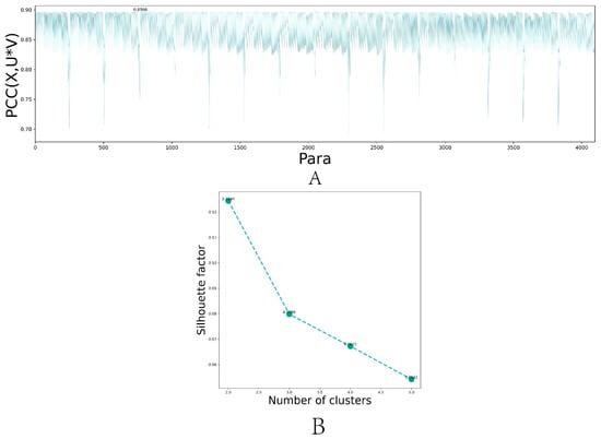 In addition, in order to evaluate the clustering performance of NMF, K-means and DL-ONMF, we counted the visualization and contour coefficient results of t-sne and PCA dimensionality reduction, respectively, when the clustering of the three algorithms was in 2–5 classes. Among them, the visualization results of t-sne dimensionality reduction and contour coefficient changes of DL-ONMF algorithm are shown in Figure 3. Other cases are shown in the supplementary material. As can be seen in Figure 3 and Figures S1–S3 in the supplementary material, the proposed algorithm obtains the highest contour coefficients in both classes of cases. In addition, it can be seen from the dimensionality reduction visualization that the proposed algorithm has a clearer clustering effect in the two types of cases.