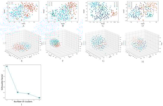 Results obtained under the best parameters for different cluster numbers. (A–D) are 2D visualized scatter plots of other cluster numbers (2 to 5) obtained using the t-sne dimensionality reduction algorithm. (E–H) are 3D visualization scatter plots of different cluster numbers (2 to 5) obtained using the t-sne dimensionality reduction algorithm. (I) is the line plot of the contour coefficient change as the number of clusters increases.