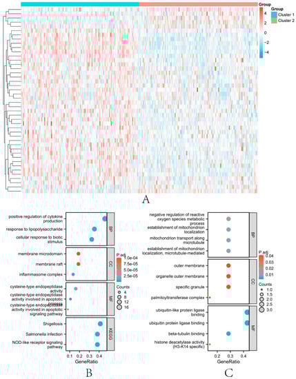 Results of differential and enrichment analysis of genes in the two subtype groups. (A) 44 differentially expressed genes ( < 0.05) in the two subtype groups. (B) the bubble plot of the GO pathway and KEGG pathway in which up-regulated genes are involved. (C) the bubble plot of the GO pathway and KEGG pathway in which down-regulated genes are involved.