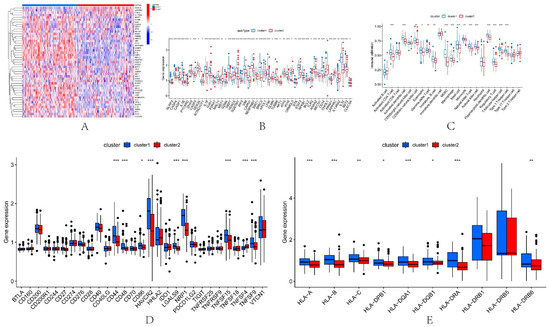 Immune features in the two pyroptosis-related clusters. Heatmap (A) and boxplot (B) of 47 DEPRGs in the typing dataset. (C) The difference in the abundance of immune cells between cluster1 and cluster2. (D) Expression differences between cluster1 and cluster2. (E) Expression differences of HLA-related genes between cluster1 and cluster2. * p < 0.05, ** p < 0.01, *** p < 0.001.