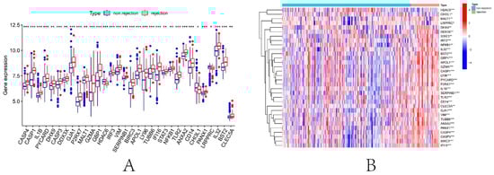 Identification of DEPRGs in kidney transplantation. (A) Boxplot of 33 DEPRGs expression. (B) Expression heatmap of 33 DEPRGs. * p < 0.05, ** p < 0.01, *** p < 0.001.