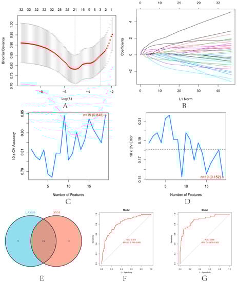 Machine learning in screening candidate diagnostic biomarkers for renal transplantation. (A) Plot of partial likelihood deviance. (B) Plot of LASSO coefficient profiles. Accuracy (C) and error (D) of 10-fold cross-validation (CV) in SVM-RFE algorithms, respectively. (E) Venn diagram showing the characteristic genes shared by LASSO and SVM-RFE algorithms. ROC curve evaluates the diagnostic performance of characteristic genes in GSE21374 (F) and GSE36059 (G).