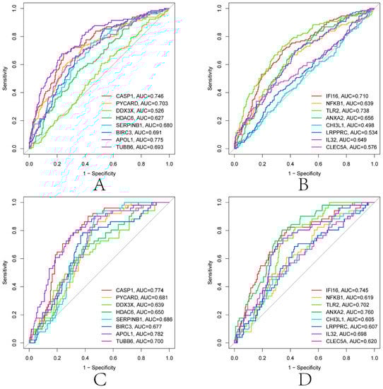 LASSO and SVM-RFE were used to screen further the diagnostic features related to renal transplantation. The partial likelihood deviations and coefficients of LASSO versus logλ show (Figure 7A,B) that 21 diagnosis-relevant PRGs (CASP1, IL1B, PYCARD, DDX3X, GJA1, GBP1, HDAC6, SERPINB1, BIRC3, APOL1, p < 0.05) were identified. TUBB6, IFI16, STAT3, NFKB1, TLR2, ANXA2, CHI3L1, LRPPRC, IL32, BST2, and CLEC5A). According to the importance of SVM-RFE calculation and ten-fold cross-validation results (Figure 7C,D), 19 kidney transplant diagnosis-related PRGs (ANXA2, CASP1, TLR2, PYCARD, DDX3X, IL32, APOL1, SERPINB1, CLEC5A, NFKB1, and PRGS (ANXA2, CASP1, TLR2, PYCARD, DDX3X, IL32) were identified. LRPPRC, CHI3L1, TUBB6, HDAC6, GZMA, CD14, BIRC3, IFI16, and DHX9). Then, we intercrossed the diagnostic genes screened by the two algorithms, and a total of 16 renal transplantation diagnosis-related PRGs (CASP1, PYCARD, DDX3X, HDAC6, SERPINB1, BIRC3, APOL1, TUBB6, IFI16, NFKB1, TLR2, ANXA2, PRGS) were obtained. CHI3L1, LRPPRC, IL32, and CLEC5A) (Figure 7E). To evaluate the predictive accuracy of the diagnostic model, ROC curves were plotted for the GSE21374 and GSE36059 datasets. The AUC of GSE21374 and GSE36059 was 0.886 and 0.813, respectively (Figure 7F,G). Finally, we plotted separate ROC curves for the 16 diagnostically relevant PRGs. In Figure 8A–D, 16 genes also showed better diagnostic performance in GSE21374 and GSE36059 alone. Specifically, CASP1 had the best diagnostic performance, with an AUC of 0.774 in the ROC curve of the GSE21374 dataset.