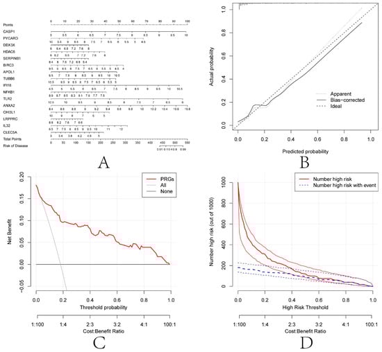 To further explore these 16 diagnosis-related PRGs (CASP1, PYCARD, DDX3X, HDAC6, SERPINB1, BIRC3, APOL1, TUBB6, IFI16, NFKB1, TLR2, ANXA2, CHI3L1, LRPPRC, IL32, and CLEC5A), a nomogram model was constructed based on these 16 genes (Figure 9A). The calibration curve showed that the nomogram model based on the 16 diagnosis-related PRGs was in good agreement with the ideal model (Figure 9B). DCA analysis showed that although both the nomogram model and individual diagnosis-related PRGs generated net benefits, the net use of the nomogram model was significantly greater than that of individual diagnosis-related PRGs, indicating that the nomogram model may be more clinically useful than individual diagnosis-related PRGs (Figure 9C). Analysis of the clinical impact curves showed that the nomogram model had relatively high diagnostic power (Figure 9D).
