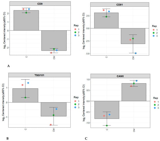 Protein content−based EV characterisation. Graphs representing the log2 centred intensity of various protein markers in the control, as well as the conditioned media control, validating the presence of EVs according to the MISEV guidelines. (A) represents is the intensity of the markers CD9 and CD81 to fulfil the MISEV criteria for markers of transmembrane or GPI-anchored proteins associated to plasma membrane and/or endosomes. (B) represents is the intensity of TSG101 to fulfil the MISEV criteria for a marker of cytosolic protein recovered in EVs. (C) represents is the intensity of the marker CANX to fulfil the MISEV criteria for a marker of a major components of non-EV co-isolated structures.