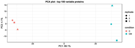 Principal component analysis (PCA) of top 100 variable proteins in the study groups. With C representing the EVs from the control group and CM representing the control conditioned media group. n = 3 for each experimental condition.