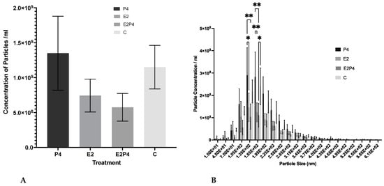 Moreover, the results indicate that the effects of all the hormone experimental conditions when compared to the control had no statistically significant differences in terms of EV concentration in vitro. A similar in vitro study showed results comparable to ours in that EVs were secreted in numbers independent of hormonal regulation, with similar concentrations seen between the estrogen and progesterone-treated groups []. However, these results and ours contradict those of an in vivo study which demonstrated that P4 increased the concentration of EVs in the uterine lumen []. However, it is important to note the different cell lines used when comparing studies, as well as the complex microenvironmental influences from different in vivo models.
