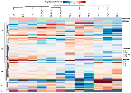 Heatmap shows the log2 centred intensity of all significant proteins with the data centred per protein. The rows represent all significant proteins and are clustered in 6 groups by k-means clustering (numbers on the left). C (control group), E2 (estrogen group), E2…P4 (estrogen and progesterone group), and P4 (progesterone group). Colours represent the abundance of significantly altered proteins (red: higher; blue: lower).