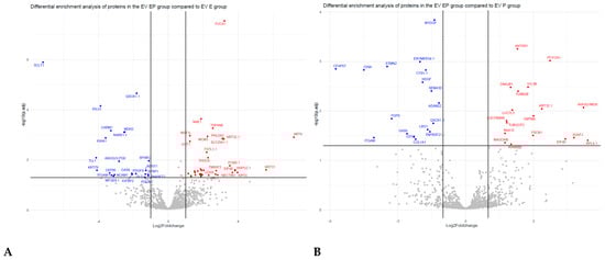 A heatmap of the log2 centred intensity of all significant proteins with the data centred per protein from the four experimental conditions showed a clear grouping of the four experimental conditions with six cluster groups, showing clear varied intensities between the EV isolated groups (Figure 5). There were 60 significant altered proteins (SAP) identified from the differential enrichment of EV proteins from the E2P4 group compared to E2 (Supplementary Table S1), 35 SAP identified from differential enrichment of EV proteins from the E2P4 group compared to the P4 group (Supplementary Table S2), 50 SAP identified from differential enrichment of EV proteins from E2vP4 (Supplementary Table S3), 31 SAP identified from the differential enrichment of EV protein from E2P4vC (Supplementary Table S4), 41 SAP identified from the differential enrichment of EV protein from E2vC (Supplementary Table S5), and five SAP identified from the differential enrichment of EV protein from P4vC (Supplementary Table S6). In the E2P4 group compared to the E2 group, 37 SAP were upregulated and 23 were downregulated. In the E2P4 group compared to the P4 group, 18 SAP were upregulated and 17 were down regulated. Volcano plots of these result show a direct indication of SAP (Figure 6). After a literature review of these proteins enriched in the E2P4 group, 17 were selected for their functional relevance in implantation success and were divided into three groups depending on their involvement in embryo implantation, endometrial receptivity, and embryo development (Table 1).