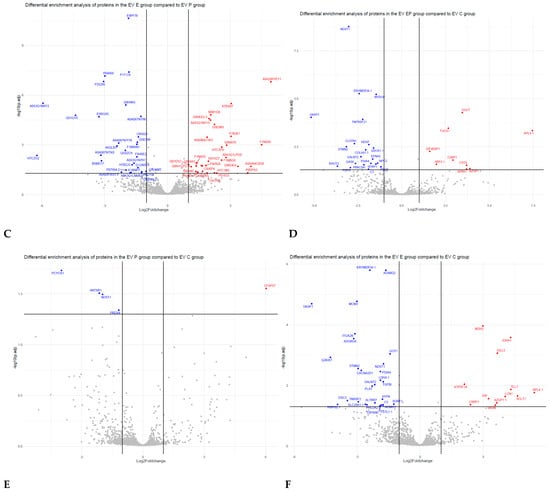 Differential enrichment of EV proteins in different comparison groups. (A) Volcano plot of the differentially expressed proteins in the estrogen plus progesterone supplemented groups (E2P4) compared to the estrogen group (E2); (B) estrogen plus progesterone supplemented groups (E2P4) compared to the progesterone group (P4); (C) estrogen supplemented groups (E2) compared to the progesterone group (P4); (D) estrogen plus progesterone group (E2P4) compared to the control (C); (E) progesterone (P4) compared to the control (C); and (F) estrogen (E2) compared to control. Adjusted p values (−log10) are plotted against the fold changes (log2). Red dots represent enriched proteins whereas blue dots represent depleted proteins in the respective comparisons.