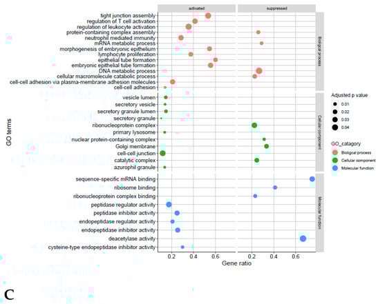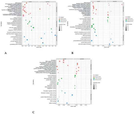 To further analyse the biological function of DEGs, GO terms and KEGG pathway enrichment analyses were performed on the three comparison groups (E2P4vE2, E2P4vP4, and E2vP4) and the controls (E2P4vC, E2vC, and P4vC) (Figure 7, Figure 8 and Figure 9). GO function analysis was conducted first. Regarding the biological process (BP), in E2P4vE2, the enriched SAP were involved in the regulation of cell communication, RNA transport, the movement of the cell or subcellular component, and protein modification (Figure 7A). In E2P4vP4, the SAP were enriched in endosomal transport, dephosphorylation, RNA transport, and mRNA transport (Figure 7B). In E2vP4, the SAP were enriched in protein-containing complex assembly, RNA catabolic process, translation, and mRNA metabolic processes (Figure 7C). In terms of molecular function (MF), in the E2P4vE2 group, enrichment was seen in cytoskeletal protein binding, microtubule binding, and GTPase regulator activity (Figure 7A). In E2P4vP4 the SAP were enriched in phosphatidylinositol phosphate binding, RNA cap binding, and ubiquitin conjugating enzyme activity (Figure 7B). In E2vP4, enrichment was seen in rRNA binding, DNA binding, and translation regulator activity (Figure 7C).