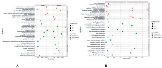 GO enrichment of SAP in the different comparison groups (A) E2P4 v E2, (B) E2P4 v P4, (C) E2vP4. The size and colour of points represents the GO category and the q-values respectively.