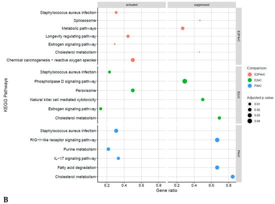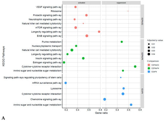 KEGG pathway analysis showed various pathways enriched in the comparison groups and control (Figure 9A,B). In E2P4vE2, enriched pathways included the mTOR signalling pathway, prolactin signalling pathway, and ErbB signalling pathway. In E2P4vP4, pathways that were intensified included the insulin signalling pathway, natural killer cell mediated cytotoxicity, and estrogen signalling pathway. In E2vP4, supressed pathways included cytokine-cytokine receptor interaction, lysosomes, and chemokine signalling pathways.