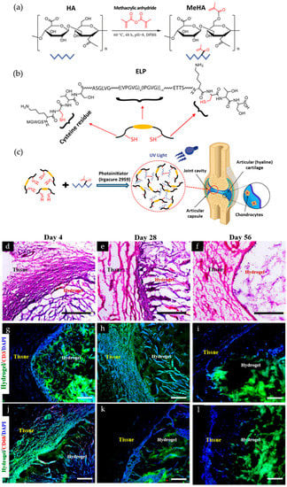 Schematic of methacrylated hyaluronic acid(MeHA)/elastin-like polypeptides(ELP) chemical structure. (a) HA methacrylation to form MeHA; (b) chemical structure of ELP; (c) schematic diagrams of photo-cross-linking of MeHA/ELP hydrogels and potential application as the adhesive composite. (d–i) In vivo biocompatibility and biodegradation of MeHA/ELP hybrid hydrogels in a rat subcutaneous implantation model. (d–f) Hematoxylin and eosin staining of MeHA/ELP sections (scale bars = 500 μm); (g–i) fluorescent images at 4, 28, and 56 days of immunohistofluorescent analysis (scale bars = 200 μm). Green, red and blue colors in (g–l) represent the MeHA/ELP autofluorescent hydrogels, the immune cells, and cell nuclei (DAPI), respectively. Hydrogels were formed by using 2% MeHA and 10% ELP at 120 s UV exposure time. Adapted with permission from [47]. Copyright 2018 American Chemical Society.