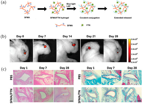 Synthesis and application of methacrylate-modified silk fibroin(SFMA)/fluorescent tracer nanoparticles (FTN) hydrogel plugs. (a) Schematic of the release of FTN from the SFMA hydrogel; (b) Long-term monitoring of SFMA/FTN hydrogel localized in the lacrimal sac of dry eye rabbits; (c) H&E and Masson staining observations for the biocompatibility assay after 1, 7, and 28 days of PBS and SFMA/FTN hydrogel in situ injection at the lacrimal duct, respectively (scale bars: 200 µm). Images reproduced with permission [64] ©WILEY-VCH Verlag GmbH & Co. KGaA, Weinheim.