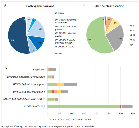 (A) The distribution of pathogenic variants found in the Dutch OI cohort. (B) The distribution of Sillence classification types in the Dutch OI cohort. (C) Combined overview of the Sillence classification type and pathogenic variants found in the Dutch OI cohort.