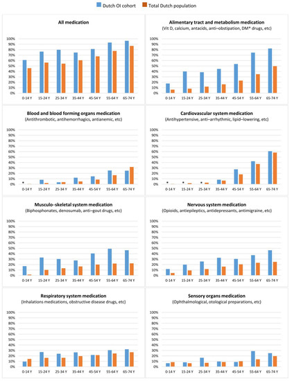 Proportion of the Dutch OI cohort and total Dutch population using medication belonging to specific ATC categories.OI, Osteogenesis Imperfecta; Y, year. * Due to low patient number exact percentage is not shown (* = <4%). Further information on ATC categories: “https://www.whocc.no/atc_ddd_index/” (last accessed on 14 November 2022).