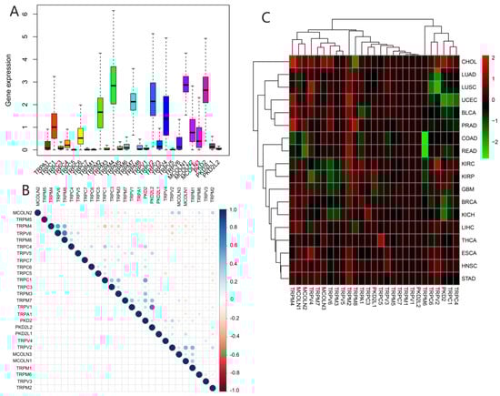 Expression levels and correlations between TRP family genes in various cancers from TCGA database. (A) Over- or underexpression of TRP family genes in various cancers. (B) Correlations between TRP family genes. Blue and red dots represent positive and negative correlations, respectively. (C) Expression data from TCGA database showing the expression of TRP family genes in various types of cancer. The color of each small rectangle represents high or low expression of TRP family genes in each cancer. Red and green indicate high and low expression, respectively.