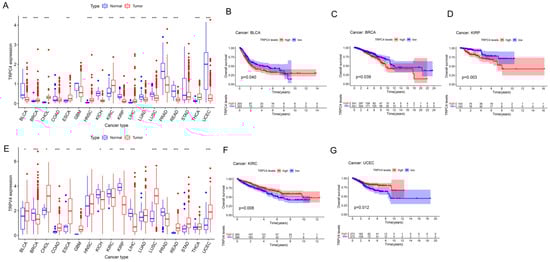 Different expression and Kaplan–Meier survival curves of TRPC4 and TRPV4 in pan-cancer (A). Differential expression of TRPC4, Kaplan–Meier survival curves of TRPC4 in (B) BLCA, (C) BRCA, and (D) KIRP. (E) Differential expression of TRPV4, Kaplan–Meier survival curves of TRPV4 in (F) KIRC and (G) UCEC. The red and blue rectangular boxes represent gene expression levels in tumor and normal tissues, respectively. * p < 0.05, ** p < 0.01, and *** p < 0.001. Red- and blue-colored names indicate high and low expressions of the corresponding TRP family genes, respectively.
