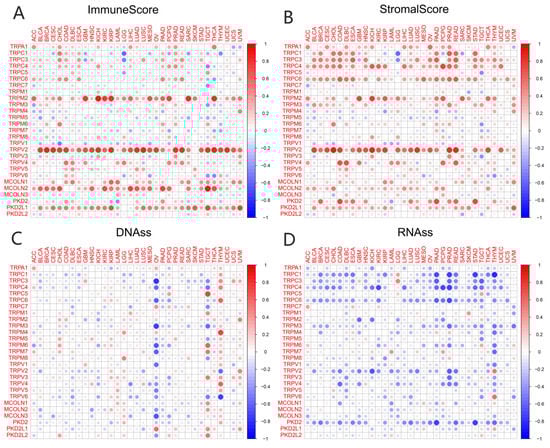 TME played a key role in stimulating cancer cell heterogeneity, increasing multidrug resistance, and contributing to cancer progression and metastasis. Our previous study had identified a predictive role for the TRP family genes in pan-cancer tissues. It is very important to explore the relationship between the expression of TRP family genes and TME in pan-cancer tissues. The ESTIMATE algorithm was used to calculate the immune and stromal scores of pan-cancer tissues (Figure 4). The scores were significantly positively correlated with the expression levels of most TRP family genes (Figure 4A,B). Similarly, a significant positive or negative correlation existed between the expression of HER family genes and RNAss (Figure 4C) and DNAss (Figure 4D) in pan-cancer tissues. The correlation and p value of all the TRP family genes in pan-cancer tissues are listed in Table S5.