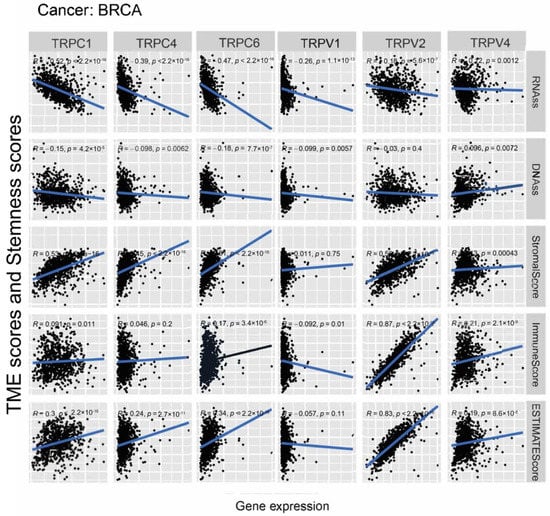 We assessed tumor stemness scores of TRP family genes in various cancers using DNAss and RNAss. The results indicated the negative role of the TRP family in characterizing cancer stem cells. To further explore the association between the TRP family and TME, stemness scores in certain types of cancer (BRCA and COAD) was analyzed. We conducted correlation analysis. The expression of TRP family genes (including TRPC1, TRPC4, TRPC6, TRPV2, TRPV4, MCOLN1, and PKD2L2) exhibited a significant positive correlation with stromal, immune, and ESTIMATE scores and negative correlation with DNAss and RNAss in BRCA and COAD (Figure 5 and Figure 6).