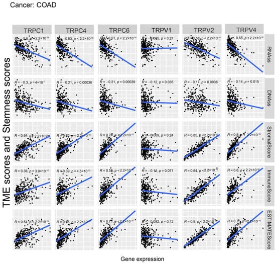 Further, we explored the association between the expression of TRP family genes and immune, stromal, estimate, and stemness scores in selected types of cancer (BRCA and COAD) (Figure 5 and Figure 6). TRP family genes exhibited extensive correlation with TME as well as DNAss and RNAss in BRCA and COAD.