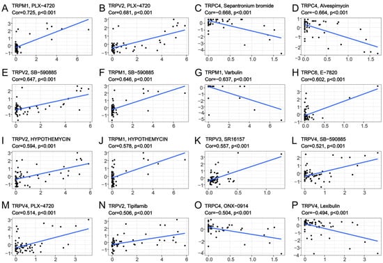 To explore the correlation between TRP family genes and drug sensitivity in various human cancer cell lines, drug sensitivity data were obtained from CellMiner. CellMiner is a database including 60 different cell lines and the sensitivity to more than 20,000 different drugs for each cell line. We mainly extracted and examined the relationship between all TRP channels and FDA−approved drugs or drugs in clinical trials. This resulted in a total of 860 kinds of drugs including, for example, Chelerythrine, Veliparib, Amuvatinib, Cytarabine, and so on. All the data downloaded from CellMiner, including the expression matrix of these cell lines, as well as the drug sensitivity, are listed in Table S8. We listed 16 TRP family genes in Figure 8 and Table S6, which were correlated with a certain drug. TRPM1 was positively correlated with the sensitivity to PLX-4720, SB-590885, and hypothemycin (Figure 8A,F,J), and negatively correlated with the sensitivity to varbulin (Figure 8G). TRPV2 was positively correlated with the sensitivity to PLX-4720, SB-590885, hypothemycin, and tipifarnib (Figure 8B,E,I,N). TRPC4 was negatively correlated with the sensitivity to sepantronium bromide, alvespimycin, and ONX-0914 (Figure 8C,D,O). Furthermore, TRPV4 exhibited positive correlation with the sensitivity to PLX-4720 and SB-590885. A negative correlation existed between the sensitivity to lexibulin and TRPV4 (Figure 8L,M,P).