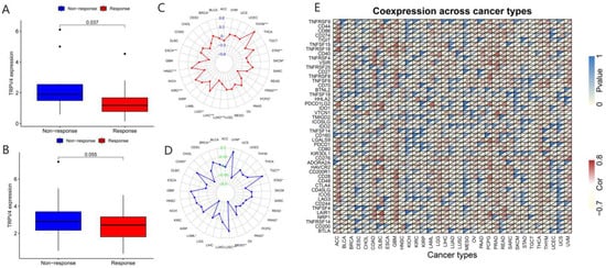 Further, we obtained the expression of TRP family genes from the TCGA database; the expression matrix is shown in Table S2, and the differently expressed TRP family genes across all tumor and para-carcinoma tissues are shown in Figure 2A,E and Supplementary. Most tumors exhibited differential expression of TRP family genes in tumor and para-carcinoma tissues.