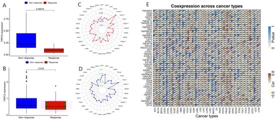 The TMB in tumor cells promotes immune recognition and correlates with the effectiveness of immunotherapy. An MSI occurs when new alleles are inserted into a tumor as a result of an alteration in microsatellites and is considered one of the hallmarks of immune-checkpoint-related therapy. These scores were computed from somatic mutation data obtained from TCGA. Two radar legends were generated to illustrate the relationship between TRPV4 and TRPC4 expression and TMB and MSI, respectively, based on Spearman’s rank correlation analysis. Additionally, coexpression analyses were performed on TRPC4 and TRPV4 with immune-activation-related genes.