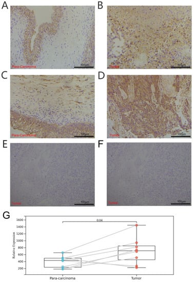 Immunohistochemical analysis of bladder cancer and para-carcinoma tissues. (A,C) Expression of TRPV4 in para-carcinoma tissues. (B,D) Expression of TRPV4 in bladder cancer tissues. (E,F) Negative control of para-carcinoma and bladder cancer tissues. (G) Paired comparison of TRPV4 in bladder cancer and para-carcinoma tissues.