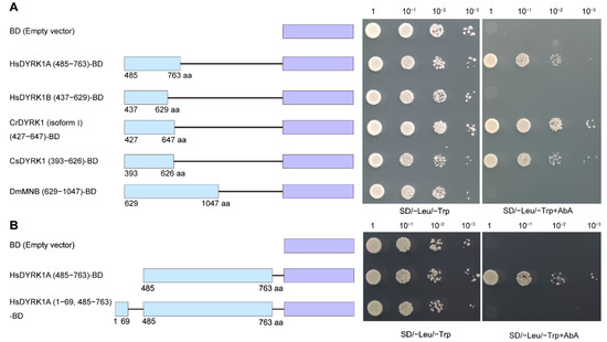 In the repression assay, CrNFAT5 (residues 77–979) and CrMyc (residues 1–681) fragments were amplified and ligated to BD vector to serve as a positive control. CrDYRK1 (isoform II) (residues 1–168) fragment was amplified and subcloned into EcoRI restriction sites of the CrNFAT5 (residues 77–979)-BD vector. CrDYRK1 (isoform II) (residues 1–168) and CrMyc (residues 1–681) fragments were amplified separately and ligated to BD vector to construct an expression vector CrDYRK1 (isoform II) (residues 1–168)-CrMyc (residues 1–681)-BD. Truncated versions of CrDYRK1 (isoform II) were amplified separately and ligated to BD vector to construct expression vector CrDYRK1 (isoform II) (residues 43–815)-BD and CrDYRK1 (isoform II) (residues 85–815)-BD. HsDYRK1A-N (1–69) fragment was amplified and subcloned into EcoRI restriction sites of the HsDYRK1A (residues 485–763)-BD vector to construct expression vector HsDYRK1A-N (residues 1–69)-C (residues 485–763)-BD.