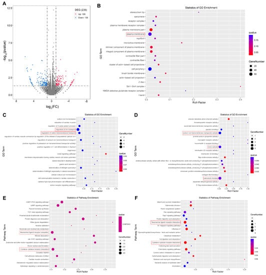 RNA-seq revealed potential roles of transactivation ability of HsDYRK1. (A) Volcano plot of the activation/repression group: 105 upregulated genes and 130 downregulated genes were identified (fold change >2 or <0.5 and p-value < 0.05). (B) Cellular component analysis of differential expression genes (DEGs): most DEGs were predicted to localize in plasma membrane (red box). (C) BP analysis of upregulated genes: upregulated genes were mainly involved in regulation of ion transport. (D) MF analysis of upregulated genes: upregulated genes were mainly enriched in calmodulin binding, motor activity, and sodium ion transmembrane transporter activity. (E) KEGG analysis of upregulated genes: upregulated genes were mainly enriched in neuroactive ligand–receptor interaction and cytokine–cytokine receptor interaction. (F) KEGG analysis of downregulated genes: downregulated genes were related to neuroactive ligand–receptor interaction and cytokine–cytokine receptor interaction.