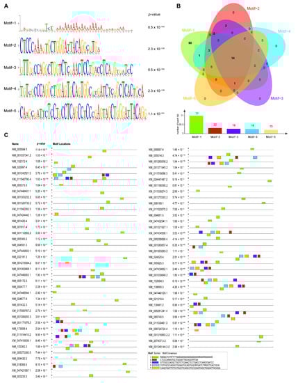 The motif analysis of upregulated gene promoters. (A) The representative DNA motifs of upregulated gene promoters: five representative motifs were shown. The height of the bases represents their frequency of occurrence at the positions. (B) The number of motif occurrences: There are 14 promoters that contained all five representative motifs. The adenine-rich DNA motif (RADACTCYRTYTYAAAAAAAAAAAAAAAAAWAAARAAAAAW) has the most broadly distributed at up to 73.95% (71/96). The Venn diagram was drawn using an online tool (https://bioinformatics.psb.ugent.be/webtools/Venn/). (C) The localization of motifs in the regulation region. These enriched motifs were mainly localized at the translation initiation site upstream 500–1000 bp of activated genes.
