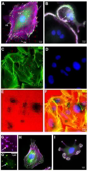 Association of F-actin with the main forms of integrin-mediated adhesions. (A) Vinculin-rich focal adhesions (FA, green), associated with the termini of actin-based stress fibers (magenta) in REF52 cells. Small ’focal complexes’ (FX) the precursors of focal adhesions are seen along the cell’s edge, and elongated ‘fibrillar adhesions’ (FB), associated with the ventral cell membrane, are found in the perinuclear region. (B) Podosomes (P) consisting of an F-actin core (magenta), and vinculin-rich adhesion ring (green) in developing (upper-right) and mature (lower-left) murine osteoclast; (C–F) cultured melanoma cell line (WM793) seeded on fluorescently labeled gelatin matrix ((E), red) and incubated for 5 h. The cells were then fixed and stained for actin ((C), green) and DAPI ((D), blue) for the detection of invadopodia and nuclei, respectively. The merged image is shown in (F). Note the prominence of actin-rich invadopodia “under” the nuclei and their close association with the dark spots, corresponding to degraded regions in the underlying gelatin matrix. (G) A magnified image of a WM793 cell depicting the relative distributions of actin-rich invadopodia in magenta (G) and vinculin in green (G’). The arrows point to a close association (yet, often with variable intensities) between the cytoskeletal-protrusive and the adhesive domains of the invadopodia. (H,I) Untreated MEF and MEF expressing constitutively active pp60Src (Y527F) were stained for vinculin (green) and actin (magenta). Notice the apparent transition of the adhesive cytoskeletal complex from the typical focal adhesion–stress fiber phenotype in the untreated cell (H) to podosome- or invadopodia-like phenotype in the cells expressing the deregulated pp60Src (I).